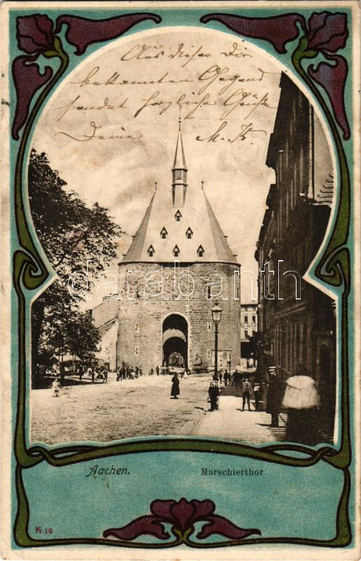 1902 Aachen, Marischerthor. Knackstedt & Näther / tower, Art N... https://www.darabanth.com/de/45-Gross-Auktion/45.1/Ansichtskarten/Deutschland~18808/1902-Aachen-Marischerthor-Knackstedt-amp-Nather-tower-Art-Nouveau-floral-litho-frame-EK~II3439126