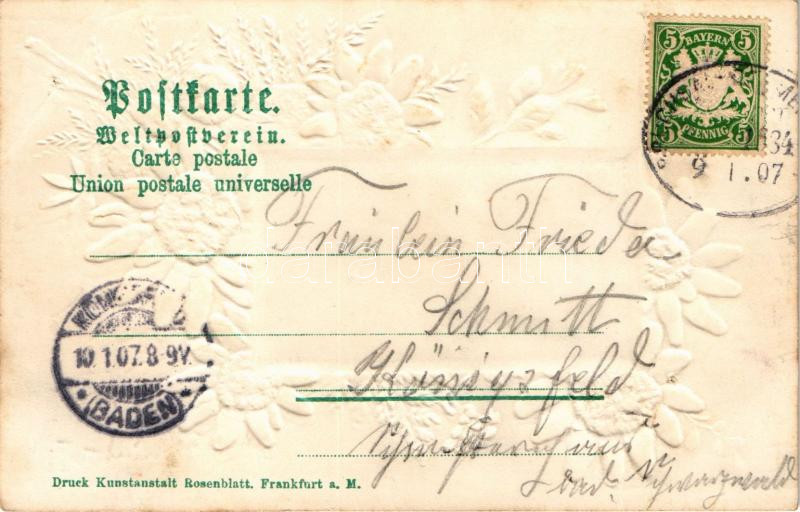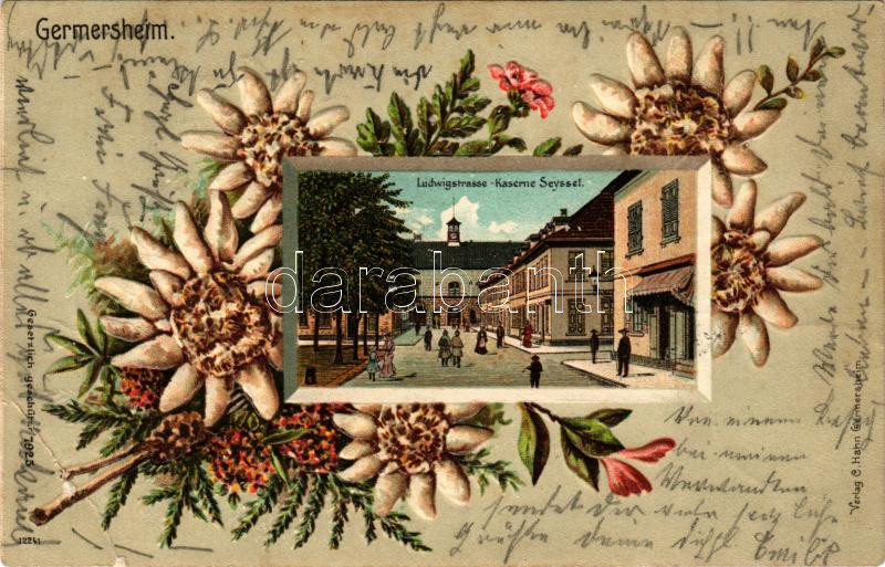 1907 Germersheim, Ludwigstrasse, Kaserne Seyssel. Verlag C. Hahn / street view, German military barracks. Rosenblatt Art Nouveau, Floral, Emb. litho (pinholes)
