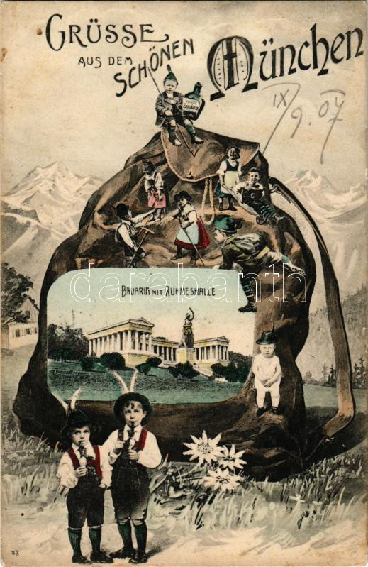 Beschreibung: 1917 München, Munich; Bavaria mit Ruhmeshalle. Verlag Franz Joseph Huber / montage with backpack and hiking children (fl)