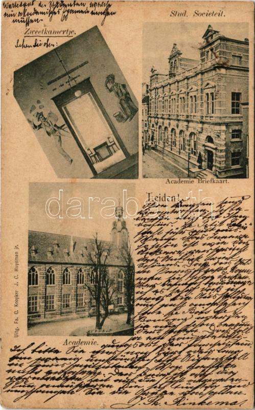 1900 Leiden, Academie, Zweetkamertje, Academie Briefkaart, Stud. Societeit. Uitg. Fa. C. Kooyker J. C. Huysman jr. / Academy, Sweat Room (a room where students or PhD candidates wait for the presentation of their diploma) (small tear)