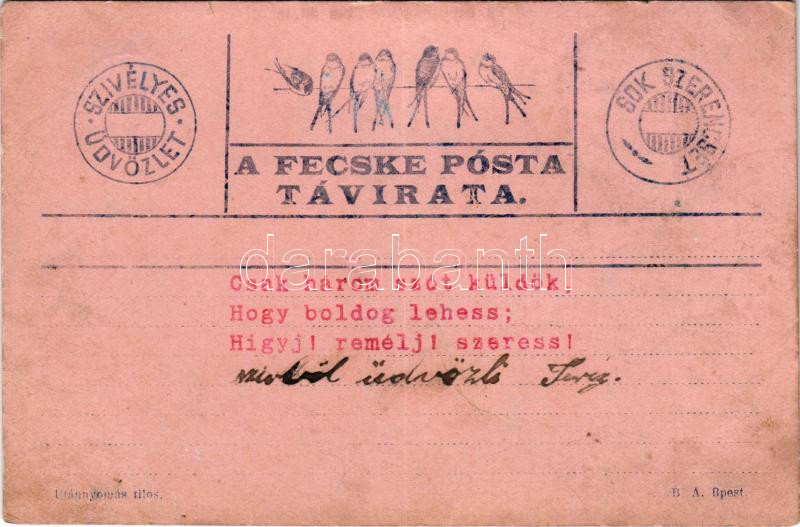 Beschreibung: Szívélyes üdvözlet - Sok szerencsét! A Fecske Posta távirata / Telegraph of the swallow post (EB)