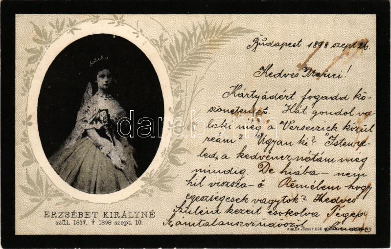 1898 Erzsébet királyné (Sissi) gyászlapja 1837-1898. Rigler József Ede... https://www.darabanth.com/de/45-Gross-Auktion/45.1/Ansichtskarten/Herrscher-Politiker-Konigshauser~18855/1898-Erzsebet-kiralyne-Sissi-gyaszlapja-1837-1898-Rigler-Jozsef-Ede-rt-Obituary-card-of-~II3431148