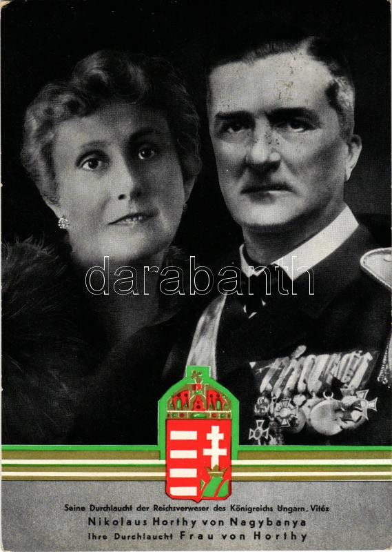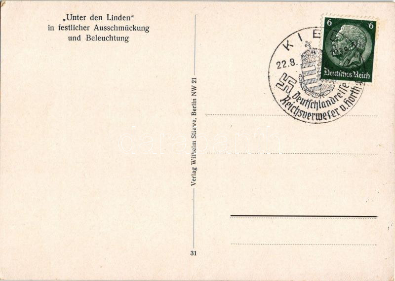 1938 Horthy Miklós kormányzó és Horthy Miklósné Purgly Magdolna, magyar címer / Seine Durchlaucht der Reichsverweser des Königreichs Ungarn Vitéz Nikolaus Horthy von Nagybánya, Ihre Durchlaucht Frau von Horthy. "Unter den Linden" in festlicher Ausschmückung und Beleuchtung + "Deutschlandreise Reichsverweser v. Horthy Kiel 22. 8. 1938" So. Stpl (EM)