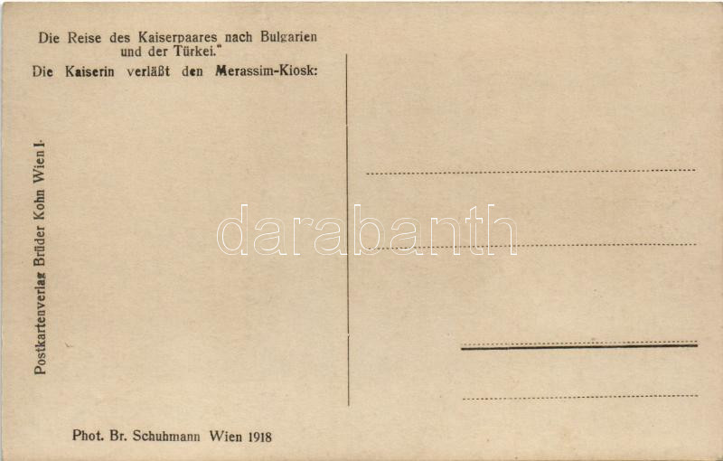 Die Reise des Kaiserpaares nach Bulgarien und der Türkei, die Kaiserin verlässt den Merassim-Kiosk. Phot. Br. Schuhmann, Brüder Kohn Wien I. / The journey of the imperial couple to Bulgaria and Turkey, Empress Zita leaves the Merassim Kiosk (EK)