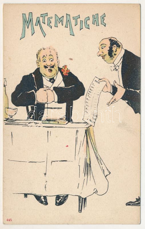 Matematiche / Italian humour art postcard, restaurant, waiter (fl) https://www.darabanth.com/de/45-Gross-Auktion/45.1/Ansichtskarten/Humor~18834/Matematiche-Italian-humour-art-postcard-restaurant-waiter-fl~II3420814