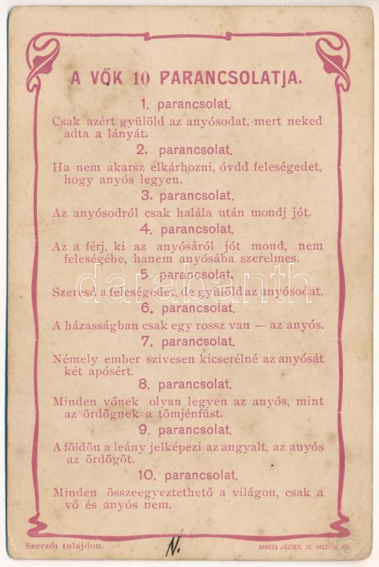 Vők 10 parancsolatja. Barcza József kiadása / Ten Commandments of son-... https://www.darabanth.com/de/45-Gross-Auktion/45.1/Ansichtskarten/Humor~18834/Vok-10-parancsolatja-Barcza-Jozsef-kiadasa-Ten-Commandments-of-son-in-laws-humour-azott-w~II3449670