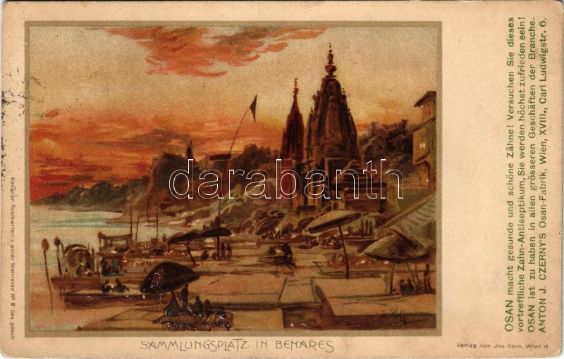 1899 (Vorläufer) Varanasi, Benares; Sammlungsplatz. Osan macht gesunde und schöne Zähne! Künstler Postkarten v einer Weltreise No. 8. Ges gesch. Verlag von Jos Heim / beach, Osan toothpaste advertisement. litho s: Josef Hoffmann (fl)