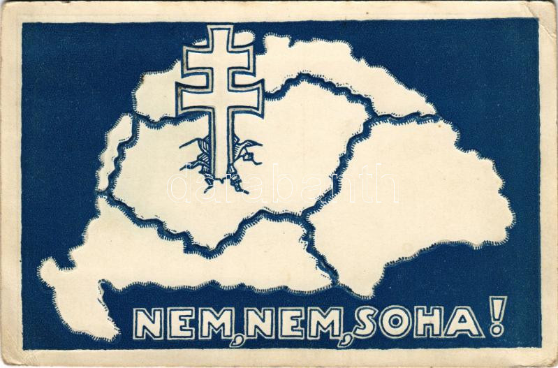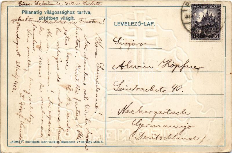 1927 Nem, Nem, Soha! Pillanatig világossághoz tartva sötétben világít. Komet önvilágító ipari vállalat kiadása, dombornyomott foszforeszkáló irredenta lap Trianoni térképpel és a Magyar Koronával / Hungarian embossed phosphorescent irredenta art postcard with Trianon map and the Crown (EB)