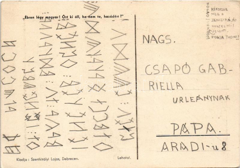 Ébren légy magyar! Őrt ki áll, ha nem te, hazádért? Rovásírásos irredenta művészlap. Szentkirályi Lajos kiadása, Lehotai nyomda / Hungarian irredenta propaganda written in the Old Hungarian Runic alphabet, artist signed (EK)