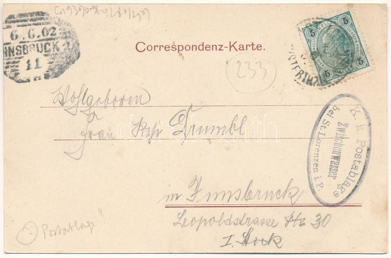 1902 Longega, Zwischenwasser (Marebbe, Enneberg (Südtirol)); Gruss aus Neu-Zwischenwasser. Gasthof Neu-Zwischenwasser des M. F. Ellecosta / inn, chapel, general view. Art Nouveau, floral + "K. k. Postablage Zwischenwasser bei St. Lorenzen i. P." (EK)
