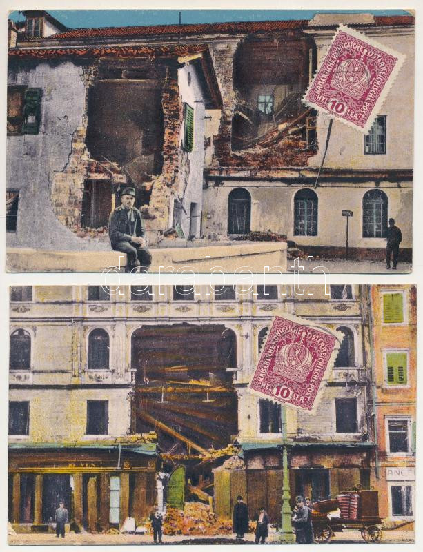 Beschreibung: Gorizia, Görz; Weltkrieg 1914-15. / 2 pre-1945 postcards: WWI Austro-Hungarian K.u.k. military: demolished houses, soldiers
