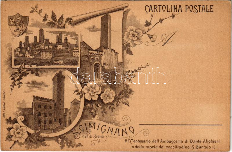 San Gimignano, VI. Centenario dell'Ambasceria di Dante Alighieri e della morte del concittadino S. Bartolo. C. Borrani / towers, general view. Art Nouveau, floral (EK)