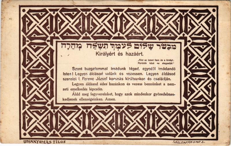 Királyért és hazáért. Héber feliratos katonai üdvözlőlap. Spatz Henrik kiadása, Judaika / WWI Austro-Hungarian K.u.k. military greeting card with Hebrew text. Judaica s: Seelenfreund S. (EB)