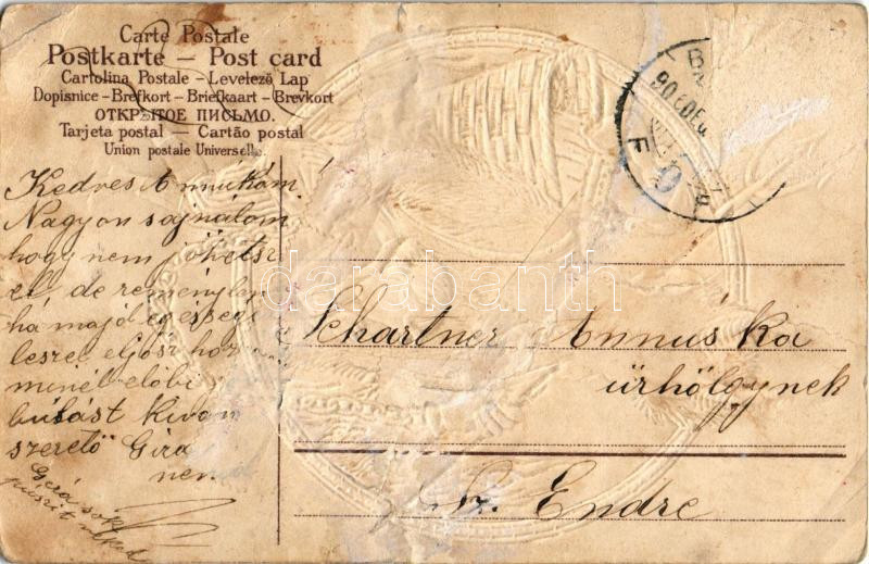 1906 Krampusz szigonnyal és láncra vert gyerekekkel. Szecessziós dombornyomott üdvözlőlap / Krampus with harpoon and chained children. Art Nouveau, Emb. litho (r)