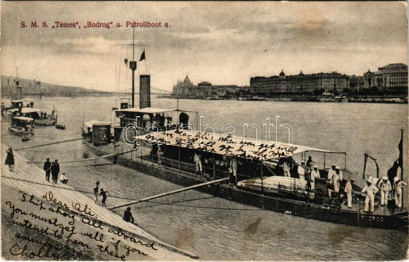 1908 Budapest, SMS TEMES, SMS BODROG monitorok és SM Pb "a" őrnaszád, matrózok. Dunaflottilla / K.u.K. Kriegsmarine Donauflottille SM Patrouillenboot "a" / Austro-Hungarian Navy Danube Fleet river guard ships and patrol boat, mariners (fl)