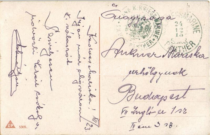 Beschreibung: 1915 Hurra! Zum Sieg gegen Italien 5309. / WWI German Navy art postcard, mariner on board + "K.u.k. Kriegsmarine S.M.S. Panther" (EK)