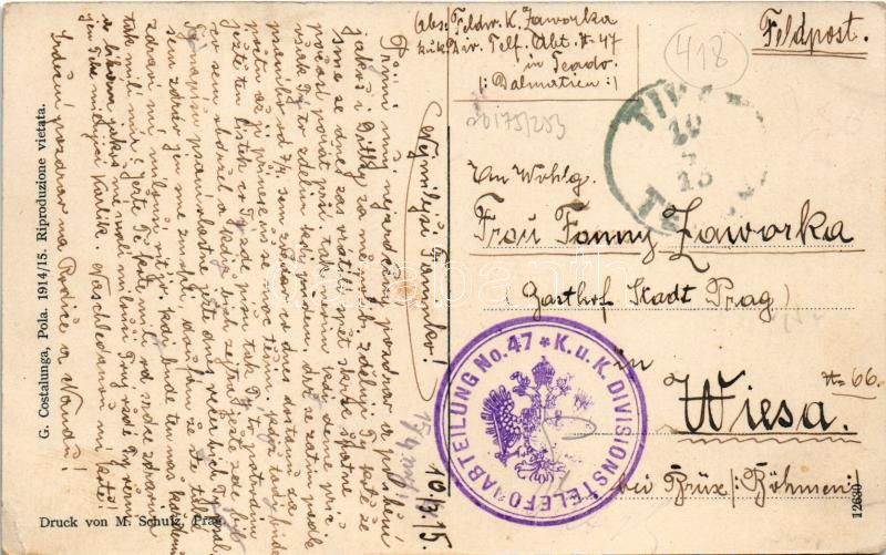 1915 SMS Erzherzog Friedrich K.u.K. Kriegsmarine / SMS Erzherzog Friedrich az Osztrák-Magyar Haditengerészet pre-dreadnought (Linienschiffe) csatahajója / Austro-Hungarian Navy pre-dreadnought battleship. G. Costalunga, Pola 1914/15. M. Schulz + "K.u.K. Divisionstelefonabteilung No. 47." (EK)