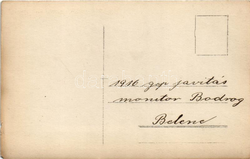 1916 SMS Bodrog a Császári és Királyi Haditengerészet monitor típusú hadihajója, matrózok a fedélzeten javítás közben; Dunaflottilla / K.u.K. Kriegsmarine Donauflottille / WWI SMS "BODROG" Austro-Hungarian Navy river guard monitor under repair work, mariners on board; Danube Flotilla. photo (EM)
