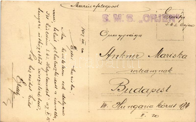 Beschreibung: 1917 SMS Helgoland az Osztrák-Magyar Haditengerészet Helgoland-osztályú gyorscirkálója / K.u.K. Kriegsmarine / WWI Austro-Hungarian Navy light cruiser. photo + "S.M.S. ORJEN" (vágott / cut)