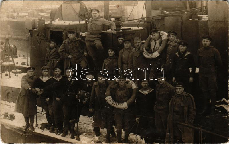 Beschreibung: 1919 SM Pb COMPO Wels-típusú őrnaszád legénysége télen a behavazott fedélzeten, egyiküknél tangóharmonika / WWI K.u.K. Kriegsmarine Patrouillenboot COMPO Danube Fleet patrol boat with crew on the snow-covered deck, mariner with accordion. photo (kopott sarkak / worn corners)