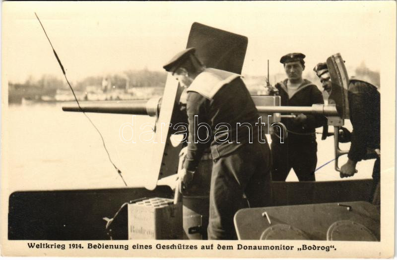 Bedienung eines Geschützes auf dem Donaumonitor "BODROG" K.u.K. Kriegsmarine Donauflottille / Császári és Királyi Haditengerészet Dunaflottilla "BODROG" monitor fedélzete matrózokkal az egyik gyorstüzelő ágyúnál / WWI Austro-Hungarian Navy Danube Fleet river guard monitor SMS BODROG, three mariners aim one of the rapid-fire guns. Kilophot Wien K. 305. (fl)