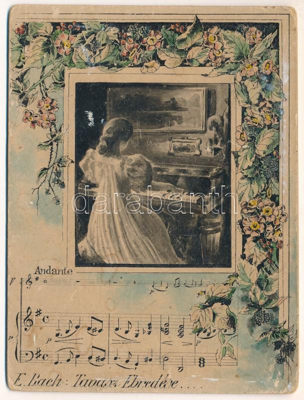 1903 Egyedi, kézzel készített kottás művészlap, E. Bach: Tavasz Ébredése, hölgy zongoránál, hátoldalon a bélyeg helyén macska / Unique handmade art postcard with sheet music, lady with pianoforte, cat as stamp. Art Nouveau, floral