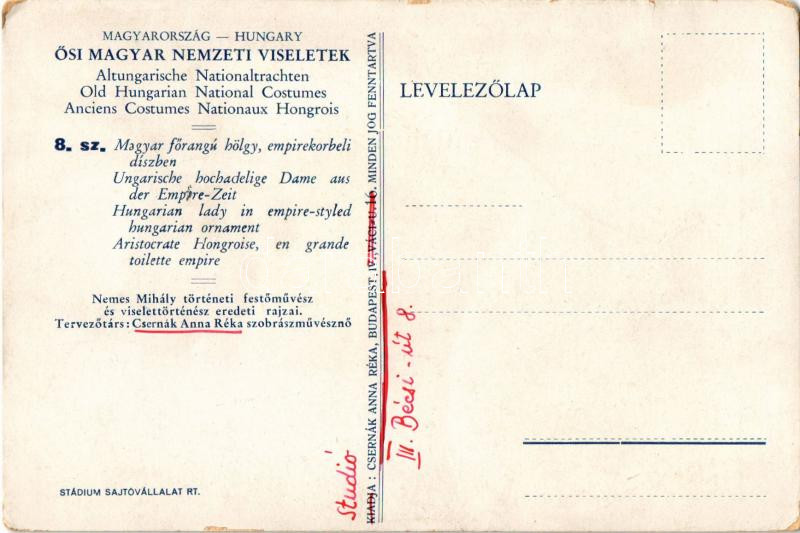Magyar főrangú hölgy, empirekorabeli díszben. Ősi Magyar nemzeti Viseletek / Hungarian noble woman s: Nemes Mihály, Csernák Anna Réka (kopott sarkak / worn corners)