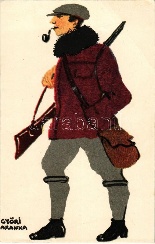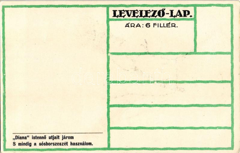 Vadász. Diana Istennő útjait járom, s mindig sósborszeszét használom! reklám a hátoldalon / Hunter. Hungarian art postcard, advertisement on the backside s: Győri Aranka (EB)