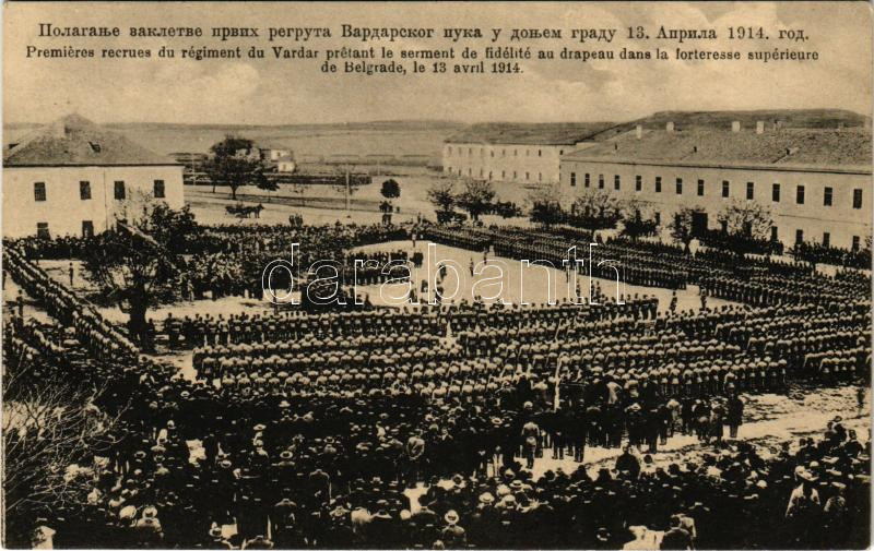 1915 Belgrádi erőd, a Vardar ezred első újoncai leteszik a hűségesküt a zászlóra a belgrádi felső erődben, 1914. április 13-án / Prémieres recrues du régiment du Vardar pretant le serment de fidelité au drapeau dans la forteresse supérieure de Belgrade, le 13 avril 1914 / First recruits of the Vardar Regiment taking the oath of loyalty to the flag in the Upper Fortress of Belgrade, April 13, 1914