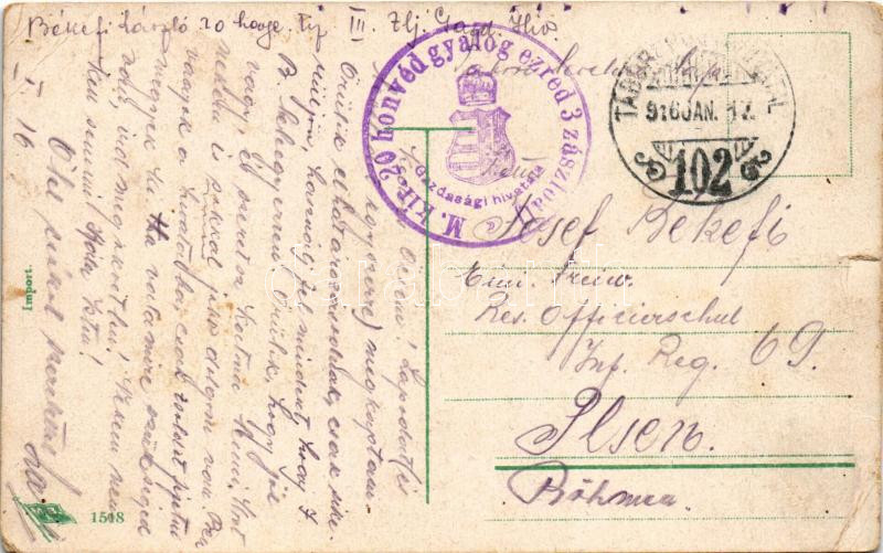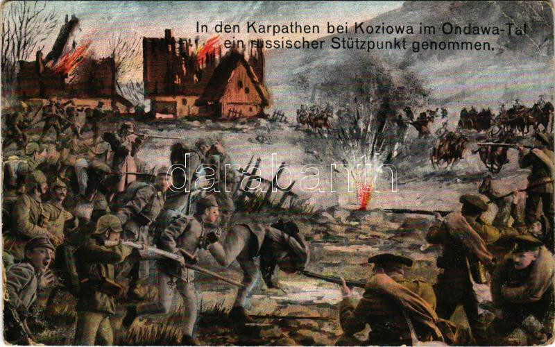 1916 In den Karpathen bei Koziowa im Ondawa-Tal ein russischer Stützpunkt genommen / Első világháborús osztrák-magyar katonai művészlap, orosz bázis elfoglalása a Kárpátokban / WWI Austro-Hungarian military art postcard, Russian base in the Carpathians + M. kir. 20. honvéd gyalogezred 3. zászlóalj Gazdasági hivatala" + "Tábori Postahivatal 102" (szakadás / tear)