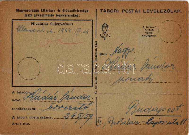 1943 Magyar Húsvét. Második világháborús Tábori Postai Levelezőlap, húsvéti üdvözlet / WWII Hungarian military field postcard with Easter greeting (EK)