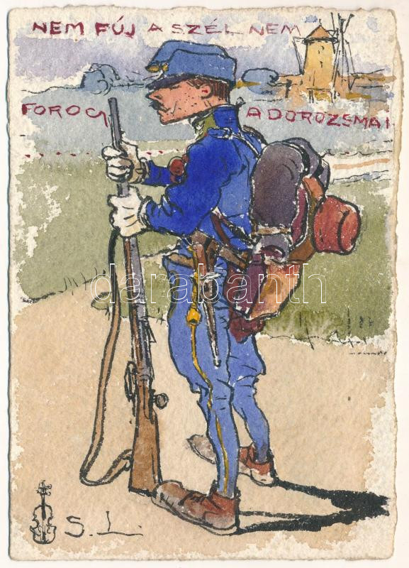Kiskundorozsma (Szeged), "Nem fúj a szél, nem forog a dorozsmai", dorozsmai öreg malom, szélmalom, katona menetfelszerelésben, kézzel festett egyedi katonai művészlap / windmill, soldier, hand-painted military postcard. artist signed