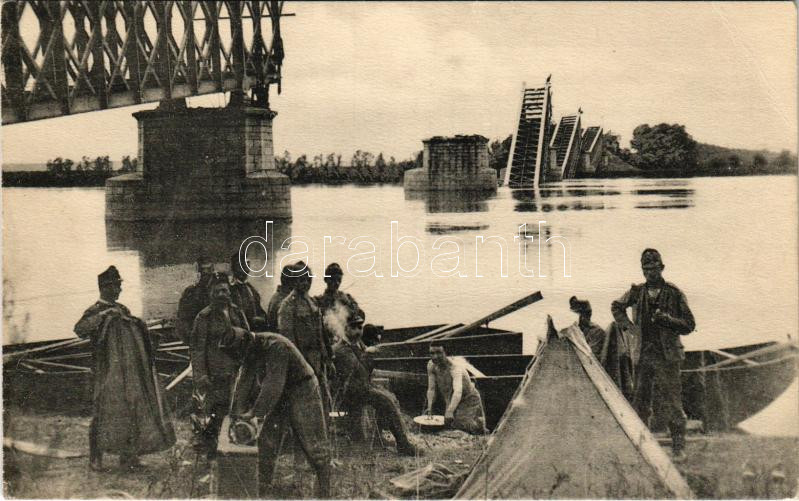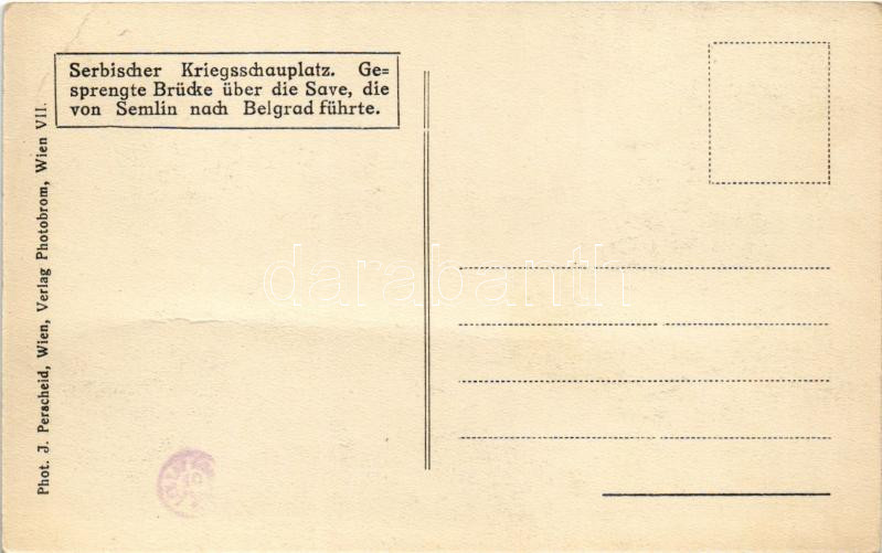 Serbischer Kriegsschauplatz. Gesprengte Brücke über die Save, die von Semlin nach Belgrad führte / WWI Austro-Hungarian K.u.K. military, destroyed Sava bridge. Phot. J. Perscheid (fa)