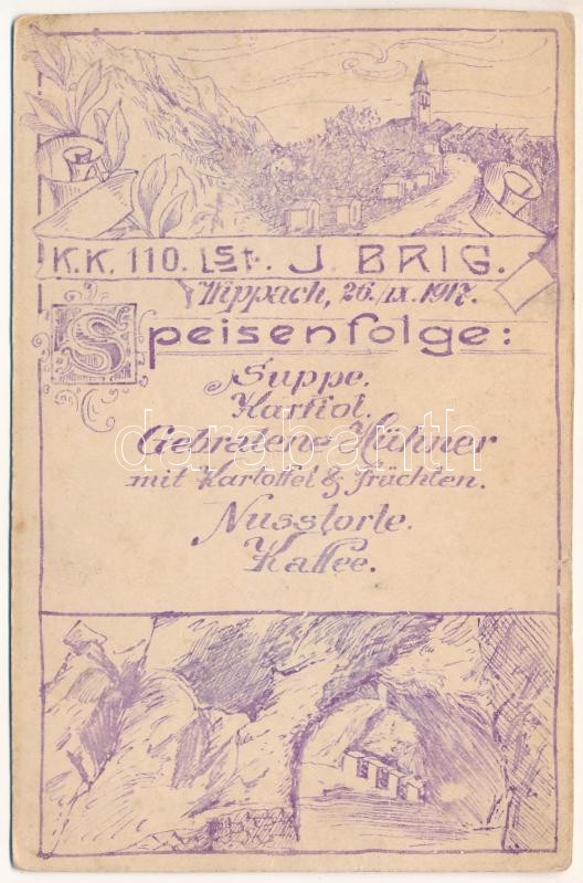 Vipava, Wippach; Első világháborús osztrák-magyar katonai ebéd menü / ... https://www.darabanth.com/de/45-Gross-Auktion/45.1/Ansichtskarten/Militaria~18838/Vipava-Wippach-Elso-vilaghaborus-osztrak-magyar-katonai-ebed-menu-WWI-Austro-Hungarian-K~II3454711