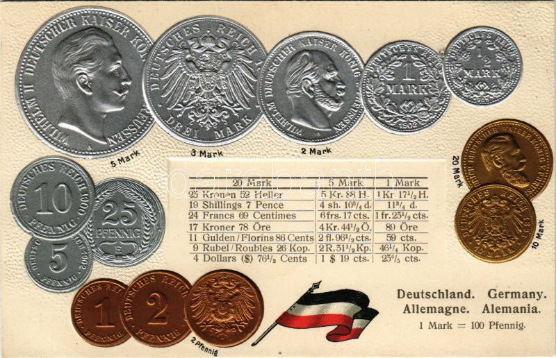 Deutschland / Allemagne / Set of coins, currency exchange chart and flag of Germany. Max Heimbrecht Berlin-Oranienburg-Eden. Emb. litho (lyuk / pinhole)