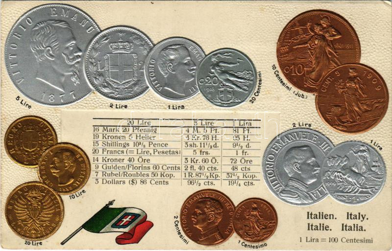 Beschreibung: Italien / Italia / Set of coins, currency exchange chart and flag of Italy. M.H. Berlin-Oranienburg-Eden. Emb. litho (lyukak / pinholes)