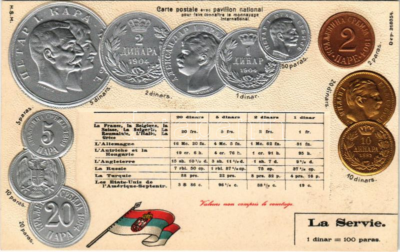 La Servie / Set of coins, currency exchange chart and flag of Serbia. ... https://www.darabanth.com/de/45-Gross-Auktion/45.1/Ansichtskarten/Numismatik~18845/La-Servie-Set-of-coins-currency-exchange-chart-and-flag-of-Serbia-HSM-Emb-litho-lyukak-pi~II3450258
