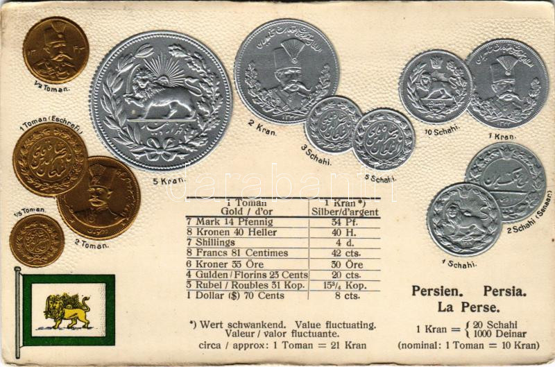 Persien / La Perse / Set of coins, currency exchange chart and flag of... https://www.darabanth.com/de/45-Gross-Auktion/45.1/Ansichtskarten/Numismatik~18845/Persien-La-Perse-Set-of-coins-currency-exchange-chart-and-flag-of-Persia-M-H-Berlin-Oranienb~II3350582