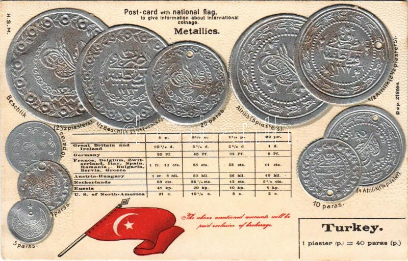 Beschreibung: Türkiye / Turkey - Set of Turkish coins, national flag, currency exchange chart. H. S. M. Emb. litho (tiny pinhole)