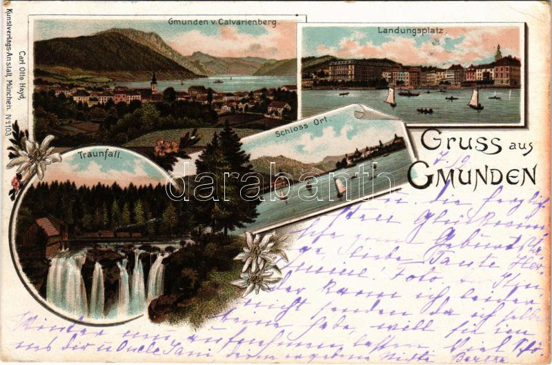1897 Gmunden, Traunsfall, von Calvarienberg, Landungsplatz, Schloss Ort. Carl Otto Hayd / general view, waterfall, castle. Art Nouveau, floral, litho (EB)