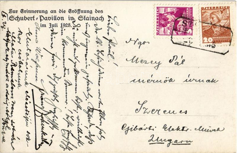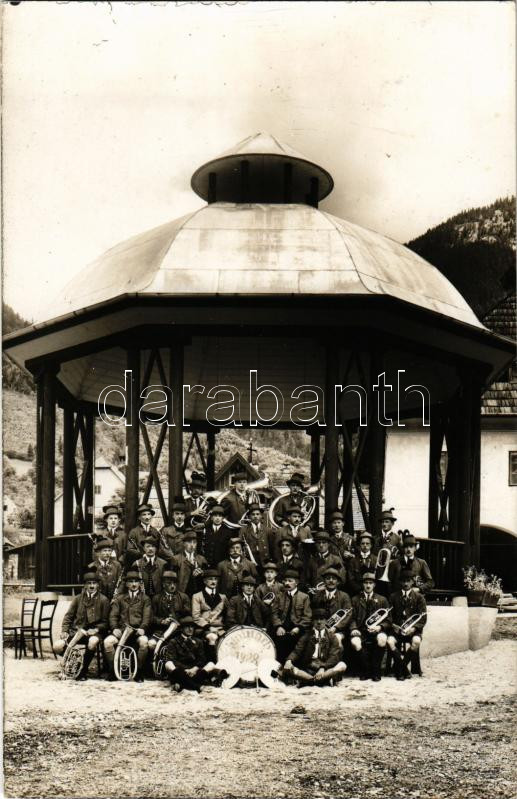 Stainach, Stainach-Pürgg (Steiermark); Zur Erinnerung an die Eröffnung des Schubert-Pavillon in Stainach im Juli 1928 / In memory of the opening of the Schubert Pavilion in July 1928, brass band, musicians