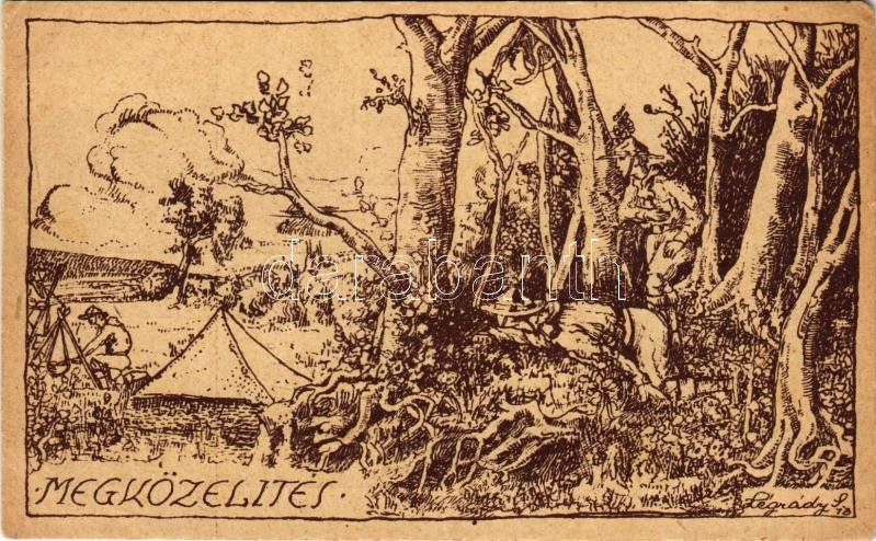 Beschreibung: 1922 Megközelítés. A Magyar Cserkészszövetség kiadása az országos cserkészjáték emlékére / Hungarian scout art postcard s: Légrády Sándor (EM)
