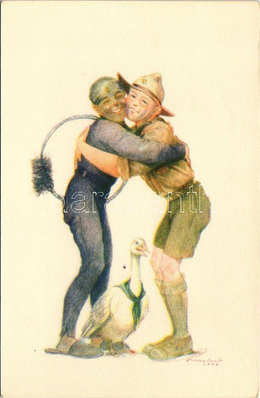 A cserkész minden cserkészt testvérének tekint. Cserkész kéményseprővel és libával. A Magyar Cserkészszövetség kiadása, Globus Budapest / Hungarian boy scout art postcard, scout with chimney sweeper and goose s: Márton L.