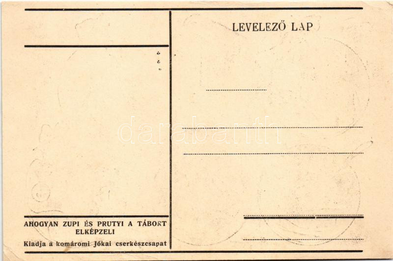 Ahogyan Zupi és Prutyi a tábort elképzeli. Kiadja a komáromi Jókai cse... https://www.darabanth.com/de/45-Gross-Auktion/45.1/Ansichtskarten/Pfadfinder~18827/Ahogyan-Zupi-es-Prutyi-a-tabort-elkepzeli-Kiadja-a-komaromi-Jokai-cserkeszcsapat-Hungarian-~II3413641