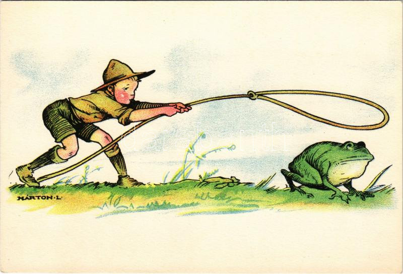Beschreibung: Cserkész békával. Magyar Cserkészszövetség, Klösz Gy. és Fia / Hungarian boy scout art postcard with frog s: Márton L.