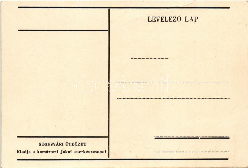 Segesvári ütközet, cserkész művészlap. Kiadja a komáromi Jókai cserkés... https://www.darabanth.com/de/45-Gross-Auktion/45.1/Ansichtskarten/Pfadfinder~18827/Segesvari-utkozet-cserkesz-muveszlap-Kiadja-a-komaromi-Jokai-cserkeszcsapat-Hungarian-b~II3413642