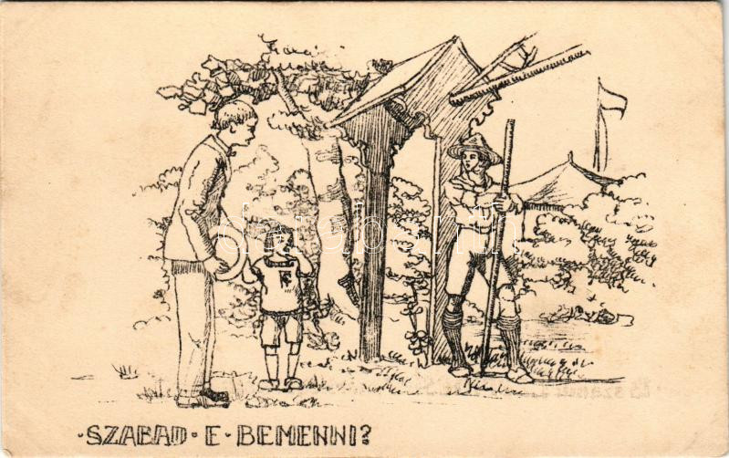 Beschreibung: Szabad-e bemenni? 13. számú Ezermester cserkészcsapat Tábori levelezőlap / Hungarian boy scout art postcard (EK)