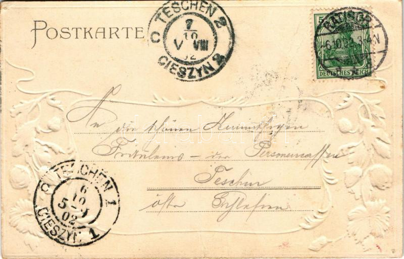 Beschreibung: 1902 Racibórz, Ratibor; Bahnhofstrasse. Kunstverlag Bruno Scholz / street. Art Nouveau, floral, Emb. litho frame (creases)