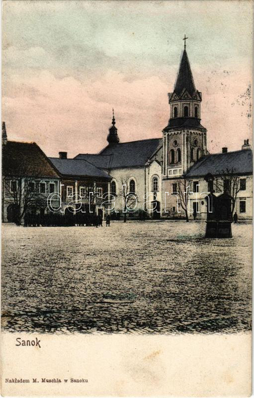 1908 Sanok, square, church. M. Muschla (fl) https://www.darabanth.com/de/45-Gross-Auktion/45.1/Ansichtskarten/Polen~18796/1908-Sanok-square-church-M-Muschla-fl~II3453184