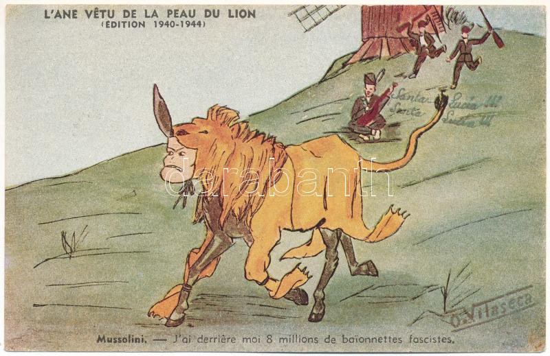 L'Ane vetu de la Peau du Lion (Edition 1940-1944). Mussolini - J'ai derriere moi 8 millions de baionettes fascistes / Második világháborús náciellenes gúnyos propaganda az olasz oroszlánnal / WWII anti-Nazi military mocking propaganda with the Italian lion s: O. Vilaseca (EK)